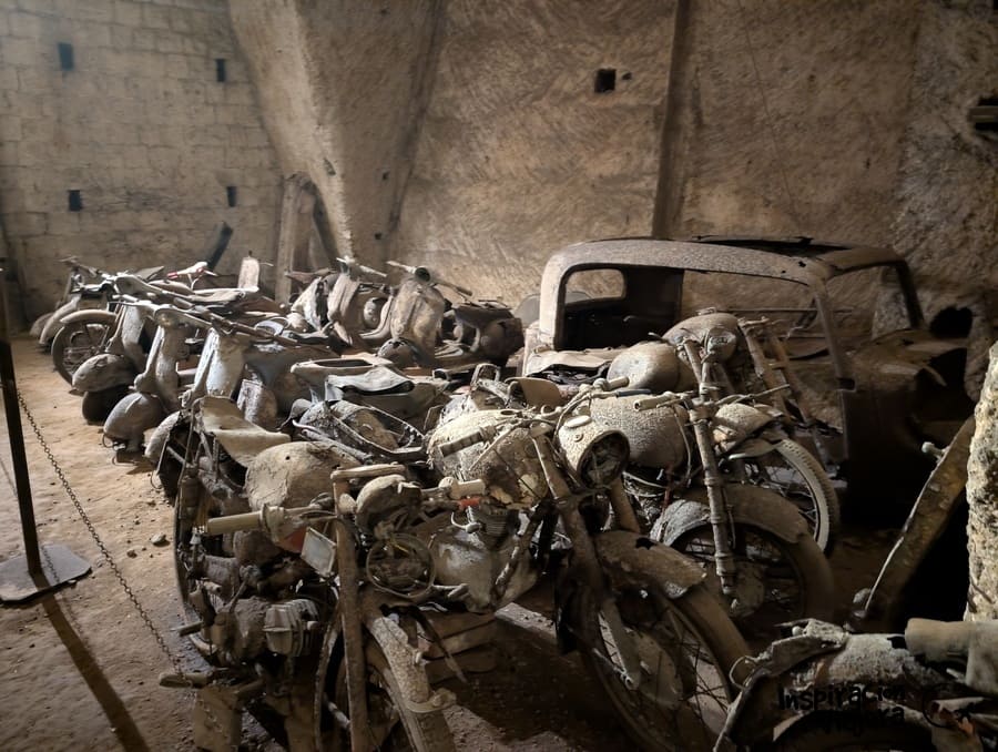 En el tour te explican (en italiano o inglés) cómo una obra de ingeniería militar del siglo XIX diseñada para la fuga de los reyes, que acabó salvando miles de vidas como refugio antiaéreo bajo las bombas de la Segunda Guerra Mundial. Además, durante la época en la que funcionó como depósito judicial, verás coches y motos de los años 40 y 50 cubiertos de polvo. Son vehículos confiscados por la policía en su época que se almacenaban aquí abajo. Muchos estaban trucados (verás alguna aberración de motos modificadas) o robados. Es como si el tiempo se hubiese detenido por completo y puedes visitarlo hoy día. Una joya.