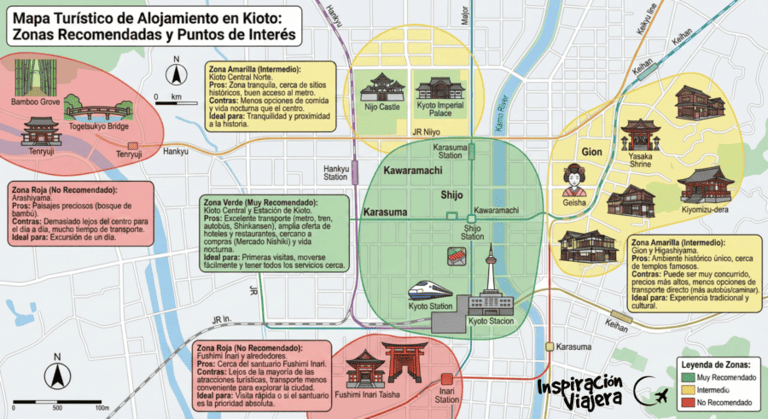 🟥 Zona Roja (No recomendado para alojarse): Zonas como Arashiyama (al oeste) o Fushimi Inari (al sur). Son visitas imprescindibles que ver en Kioto, pero tanto como para alojarse aquí no merece la pena porque están demasiado lejos de todo. Si te alojas aquí, perderás mucho tiempo en trayectos de ida y vuelta cada día.