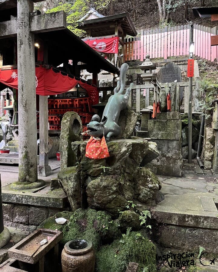 Te encontrarás estatuas de kitsune por todas partes (y muchas con objetos en la boca: llaves, pergaminos, joyas…). Son esos zorros de piedra que están vigilándote en cada rincón. En Fushimi Inari se consideran mensajeros de Inari. Por eso aparecen protegiendo el santuario, en entradas, altares y rincones del recorrido.