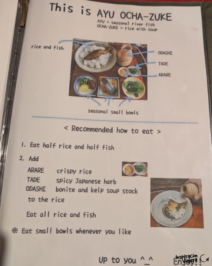 El menú viene con arroz, pescado y varios acompañamientos. Y lo curioso es que hay una forma específica de comerlo, te lo explican en papel y también de palabra. Es muy estilo ryokan, con un orden específico para que la comida sea toda una experiencia. Encima tuvimos suerte porque siendo la hora que era, estábamos totalmente solos en el salón. ¡Por cierto! Pídete el yuzu soda, que está buenísimo.