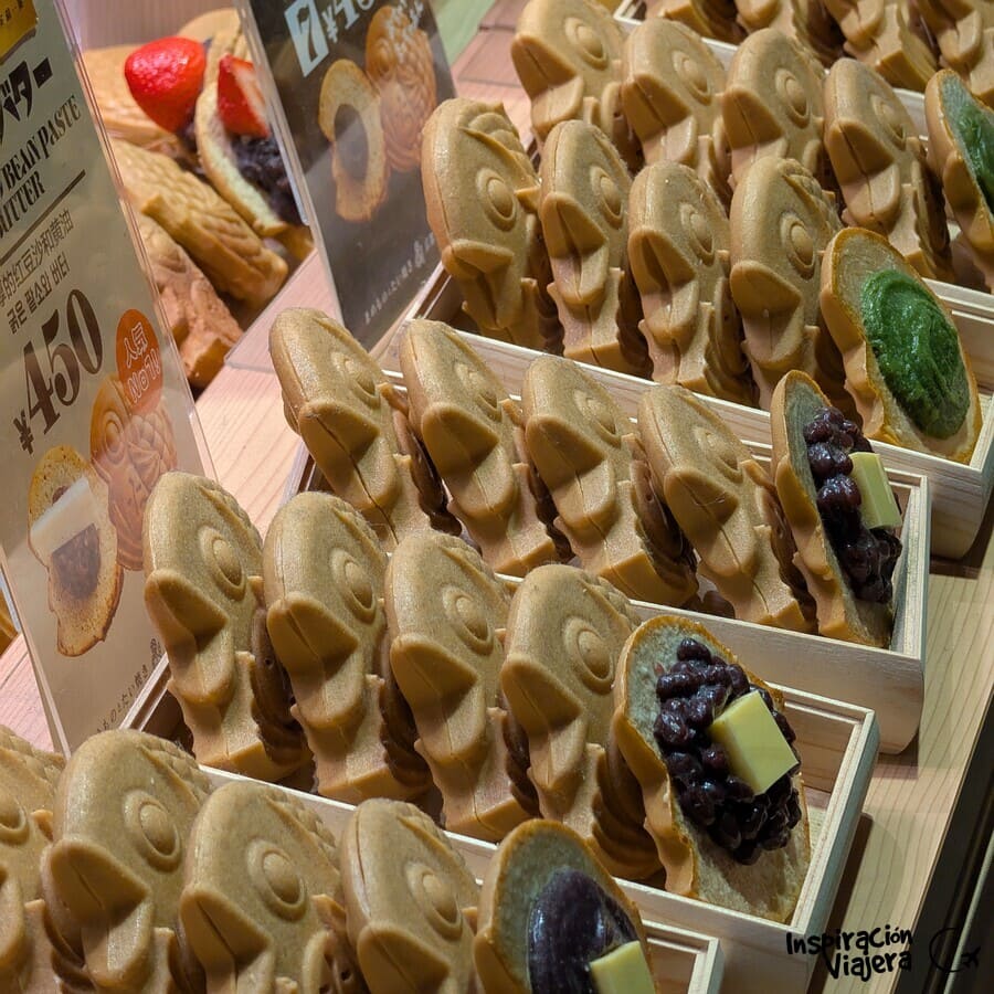 Aquí puedes probar tempuras de camarón o cangrejo, o el típico pez relleno (taiyaki) de anko, que es como una pasta de judía roja. Las tempuras nos encantaron, pero el pez no nos gustó nada. En general, todo lo que probamos con anko no nos gustó. Es un sabor un poco raro. Hay cosas mejores para gastar calorías en Japón.