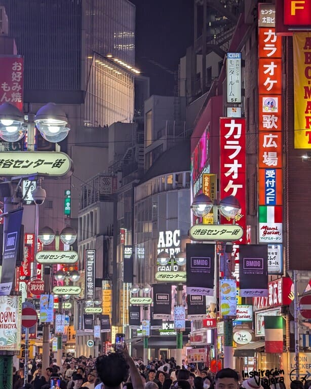 Después de las vistas desde los miradores gratuitos, seguimos explorando las calles de Shibuya, ya de noche. Y es que el barrio cambia completamente al ponerse el sol: luces de neón por todos lados, carteles de karaoke y el ambiente se anima bastante más.