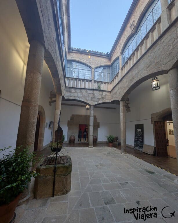 Justo al lado está el Palacio de los Cáceres-Ovando (es conocido por su Torre de las Cigüeñas). Este lugar tiene una de las mejores cosas que hacer en Cáceres gratis. Hoy pertenece al Ministerio de Defensa y tiene un pequeño museo de armas de acceso gratuito que se ve súper rápido.
