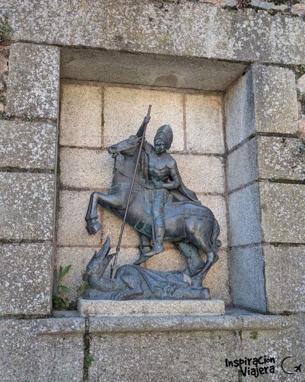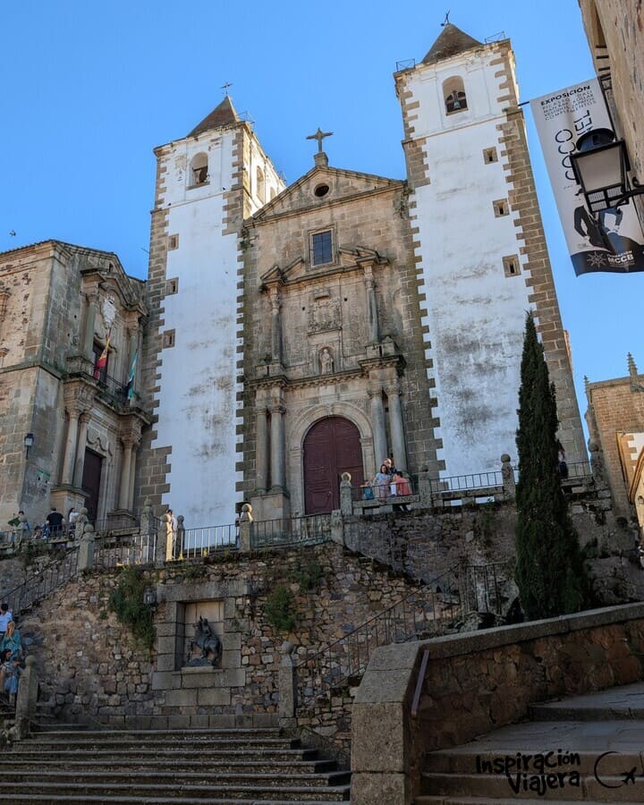 Muy cerca está la Plaza de San Jorge (patrón de la ciudad, además de mi tocayo), otra de las cosas imprescindibles que ver en Cáceres en un día. Busca la estatua de bronce del santo matando al dragón, que está rodeada por una escalinata de piedra y en lo alto se encuentra la Iglesia de San Francisco Javier. Actualmente no es posible visitar su interior porque es de propiedad privada al haberla adquirido una empresa. Una pena.