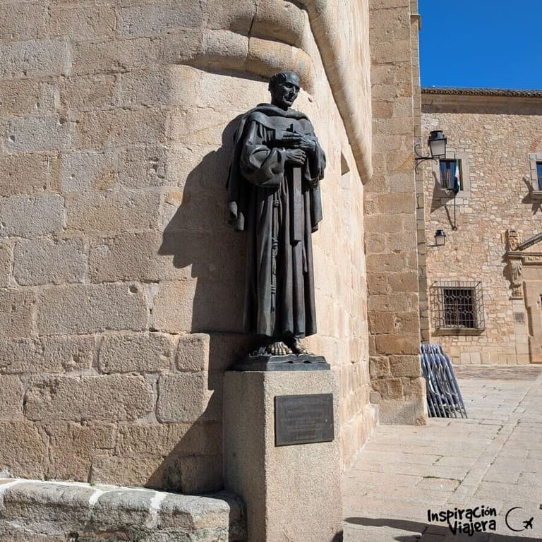Justo en la esquina de la Concatedral encontrarás el Monumento a San Pedro de Alcántara. Fíjate en que la estatua es de bronce pero los dedos de los pies están desgastados y brillantes. ¿Quieres saber por qué es? Esto es porque la leyenda dice que tienes que tocar (o besar, aunque con tocar vale y es más higiénico) los pies del santo para atraer la buena suerte o para asegurarte de que algún día volverás a Cáceres.