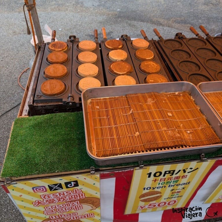En el Castillo de Osaka nos llevamos una sorpresa, porque justo a la entrada había unos puestos de comida caliente y al acercarnos vimos que eran las monedas de mozzarella que se han puesto tan de moda. La verdad es que están buenísimas. Por fuera saben como a galleta caliente y por dentro el queso va derretido. ¡Brutales!