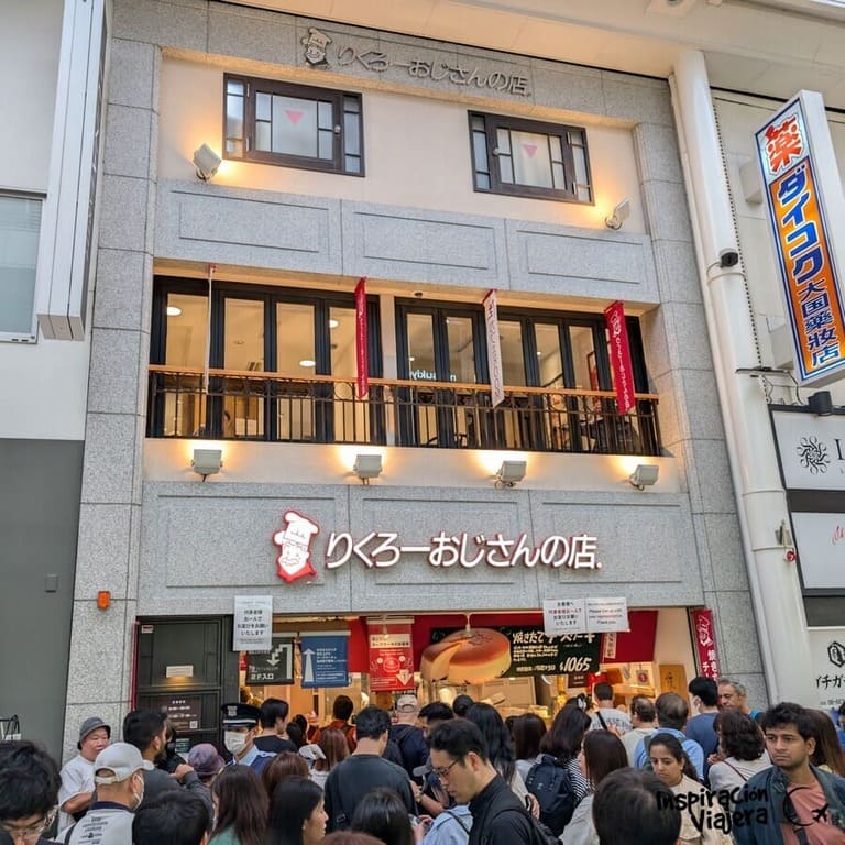 - Ebisubashi-suji Shopping Street: la galería comercial techada por la que mucha gente entra a la zona; conecta Ebisubashi con Takashimaya. En esta calle fuimos directos a la famosa tarta de queso (la de Rikuro, la que ves en todos lados). Había unos 30 minutos de cola y después de probarla nos arrepentimos de haberla hecho. Decepción total. Se hizo demasiado viral y no es para tanto. Mil veces mejor nuestra tarta de queso de la viña, por ejemplo.