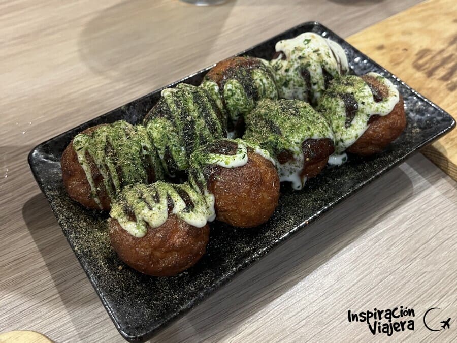 En la Dotonbori Street también probamos los takoyaki (bolas de masa rellena de pulpo) en unos puestos callejeros. Realmente creo que da igual donde lo pidas y no habrá mucha diferencia, pero si te sirve de referencia, nosotros lo pedimos en un local llamado 道頓堀酒場くれおーる (Kureo-ru), donde te puedes sentar dentro para tomártelo. ¡Así descansas un poco de la caminata que te pegarás día sí, día también!